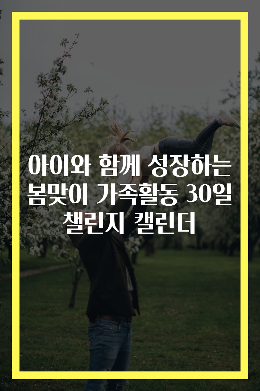봄은 자연이 다시 깨어나는 특별한 시간입니다. 이 시기의 따뜻한 날씨는 가족과 함께 야외 활동을 즐기기에 최적의 조건을 제공합니다. 이번 "아이와 함께 성장하는 봄맞이 가족활동 30일 챌린지"는 부모와 아이가 함께 소중한 시간을 보내고, 서로의 관계를 강화하며, 다양한 경험을 통해 성장할 수 있는 기회를 제공하기 위해 기획되었습니다. 이 캘린더를 통해 매일 해야 할 활동들을 소개하며, 가족이 함께하는 소중한 순간들을 만들어 갔으면 합니다.